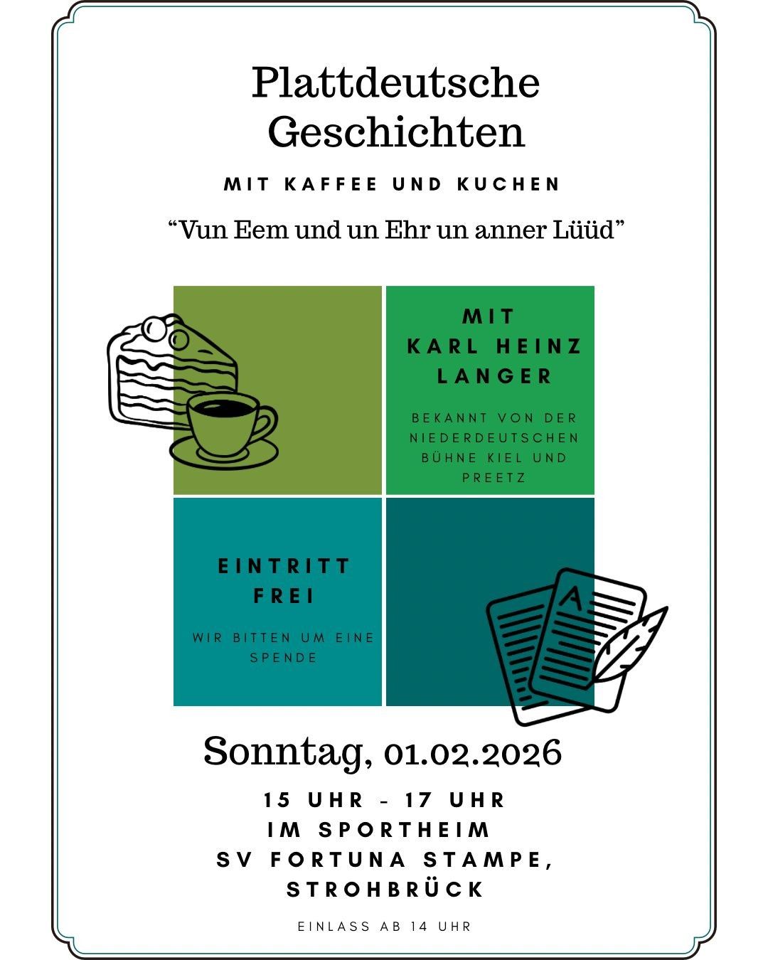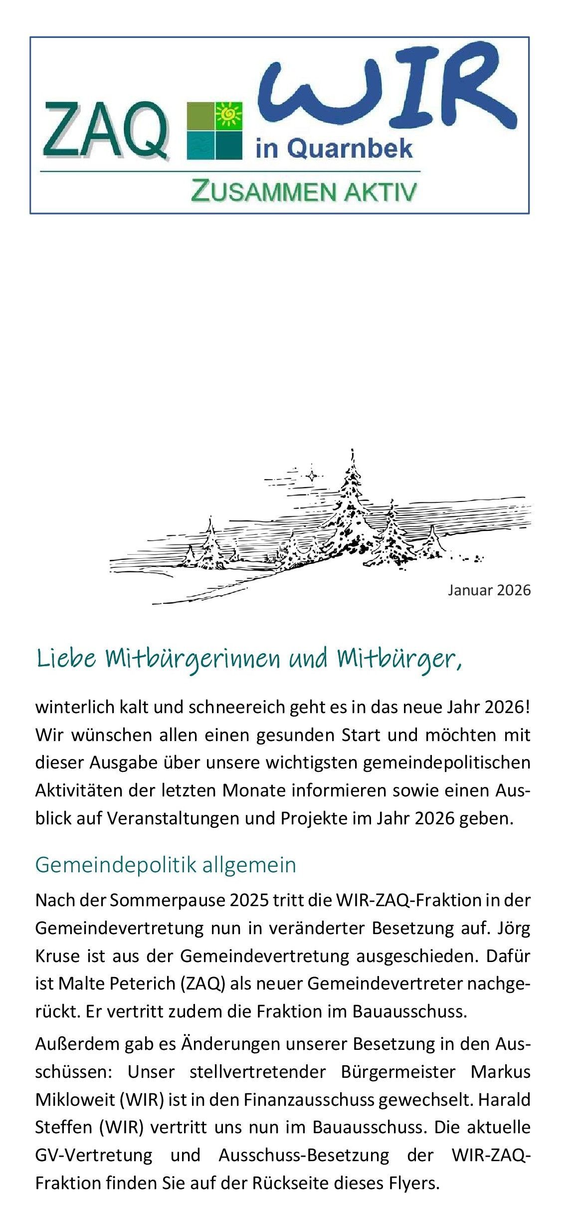 Am Dientag, den 13.05.2025 findet eine Einwohnerverammlung für alle Bürgerinnen und Bürger der Gemeinde Quarnbek statt! Start 19:30 Uhr Ort: Turnhalle der Schule Strohbrück Die Tagesordnung sieht folgende Themen vor: Wasserversorgung Strohbrück Haushaltslage der Gemeinde Neubaugebiet in der Gemeinde Offene Ganztagsschule Unter Verschiedenes sprechen wir gerne auch über Themenbereiche, die spontan aus dem Kreis der Einwohner/innen vorgetragen werden. Der Bürgermeister und die Vorsitzenden der Ausschüsse werden anwesend sein, um IhreFragen zu beantworten und auf Ihre Anliegen einzugehen .